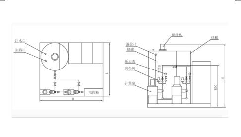 加藥裝置主要根據(jù)工藝流程向各種系統(tǒng)中注入化學(xué)藥液的成套裝置,可實(shí)現(xiàn)定量添加固體和液體化學(xué)實(shí)際。主要以計(jì)量泵為主要投加設(shè)備、將溶藥箱、攪拌器、加藥裝置液位計(jì)、安全閥、止回閥、壓力表、過濾器、緩沖器、管路、閥門、底座、扶梯、自動監(jiān)視系統(tǒng)、電力控制系統(tǒng)等集成安裝在撬裝式結(jié)構(gòu)單元。